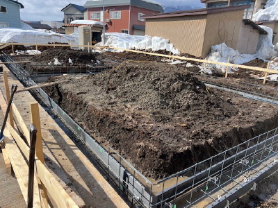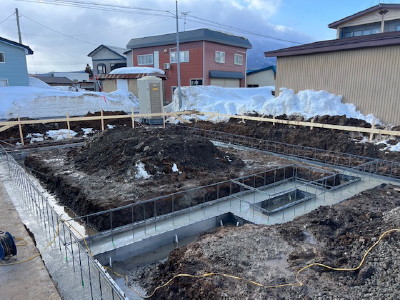 基礎配筋検査後、ベース生コンクリート打設